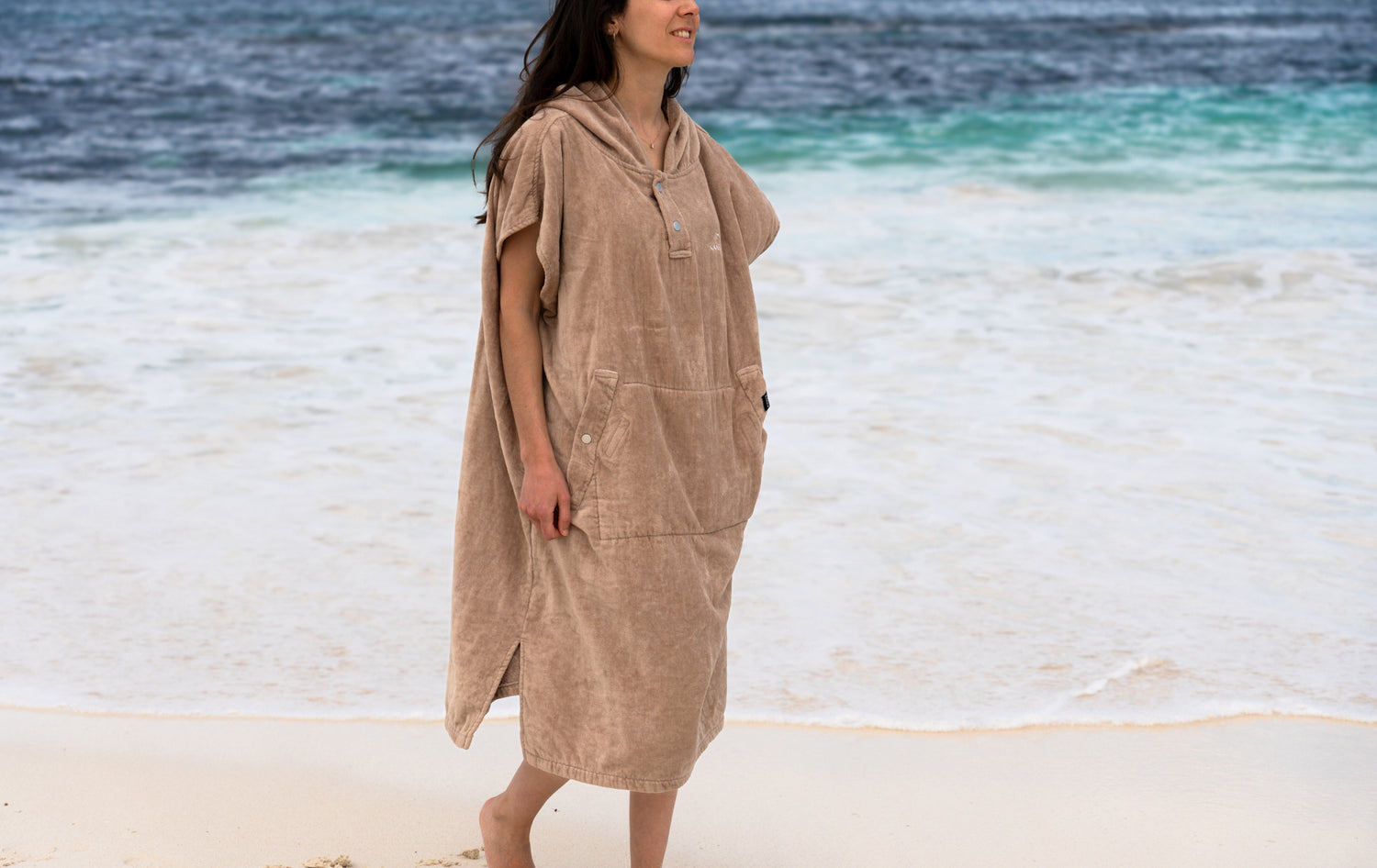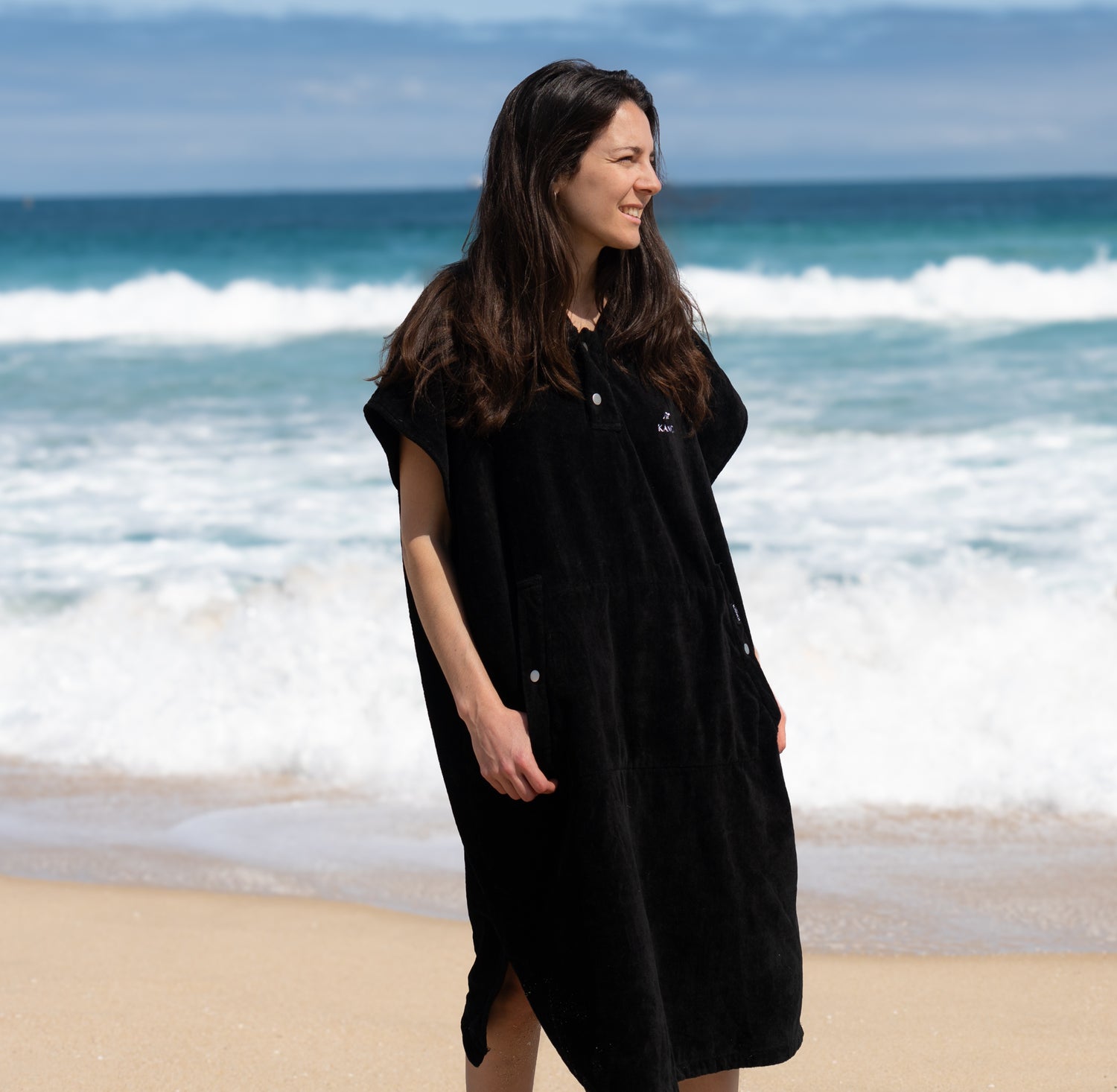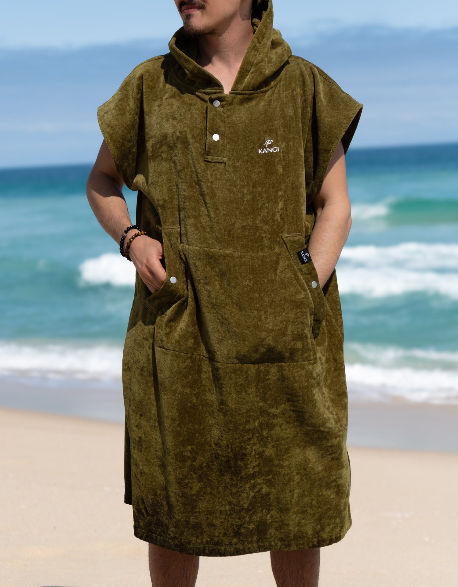 Our Kangi Hooded Towels are designed for convenience. They feature an internal access opening to slip your hands in and out for easy changing. Their generous sizing with wide sleeves, large hood, adjustable buttons, and side splits accommodate different body types, providing ample length and room for changing clothes comfortably.